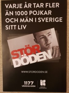 Till att börja med är uppgiften tveksam. 2017 dog 841 män och pojkar av så kallat ”säkra självmord”, d.v.s. dödsorsaken ansågs vara bekräftat. 841 individer är FÄRRE än 1000! Den korrekta texten borde således lyda: ”Varje år tar färre än 1000 pojkar och män i Sverige sitt liv”. Som kuriosa kan det nämnas att det rör sig om 838 individer över 18 år (d.v.s. män) och tre individer under 18 år (d.v.s. pojkar). Om man räknar in så kallade ”osäkra självmord” i statistiken så hamnar siffran över 1000. Den korrekta texten kan alltså lyda: ”Varje år tar kanske fler än 1000 pojkar och män i Sverige sitt liv”.