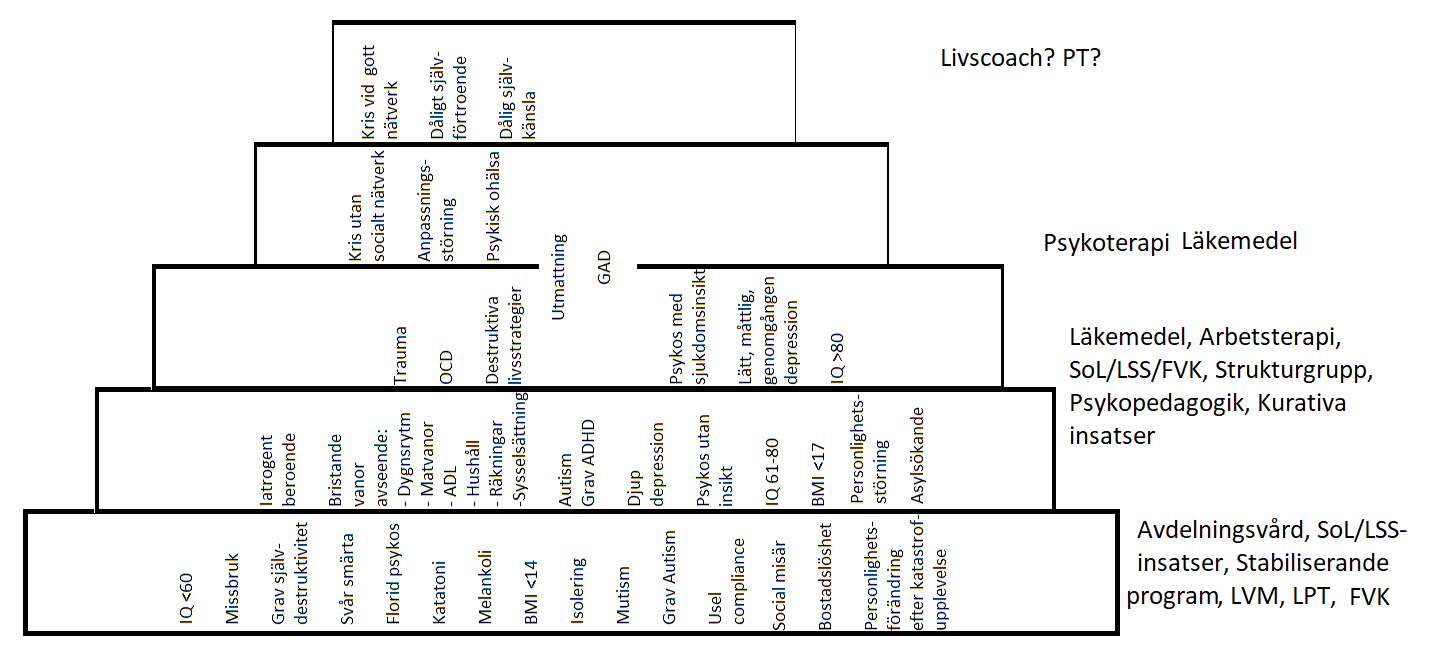 För att ge en pedagogisk översyn när olika insatser ska användas inom psykiatri började jag skissa på en behandlingstrappa: