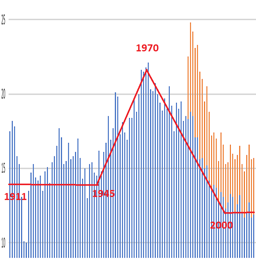 Tiden mellan 1945-1970 innebar en urbanisering av befolkningen. Kvinnorollen förändrades kraftigt, och ungdomars roll förändrades. Skilsmässorna blev fler. Fler droger kom in i landet. Motboken som begränsade alkoholkonsumtionen infördes 1919 och avskaffades 1955 (och självmorden går ju upp kraftigt 56-57). Det politiska läget var ansträngt i och med det kalla kriget. Kyrkans roll blev allt svagare. Allt detta är tänkbara faktorer som skulle kunna påverka utvecklingen av antalet självmord. Samtidigt förklarar det inte varför det vände 1970. Dessa faktorer, som teoretiskt skulle kunna påverka självmordsfrekvensen, blev ju bara starkare efter 1970, utan att självmorden ökade?