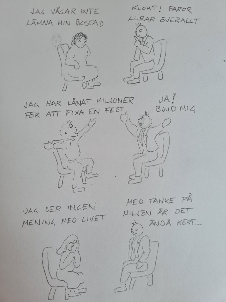 Psykiatrisk sjuklighet handlar om att patientens tankar ställer till problem vilket leder till nedsatt funktion, lidande och beteendestörningar. I behandlingen ingår det att ifrågasätta dessa tankar så att patienten får en chans att modifiera dem.