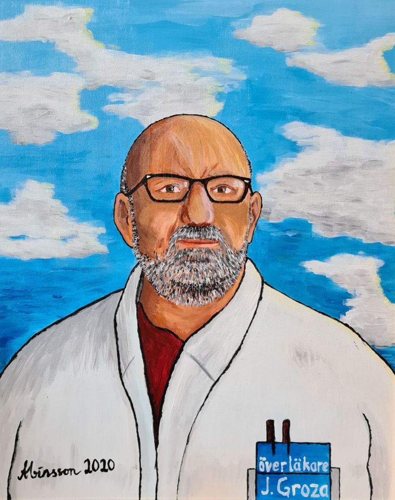 Under covidrestriktionerna 2020 bestämde jag mig för att fördriva tiden med att se om jag kunde måla, så jag målade av min kollega. Tavlan har hängt på hans kontor tills nu. När den försvann passade jag på att trycka upp en kopia som får hänga på mitt kontor framöver.