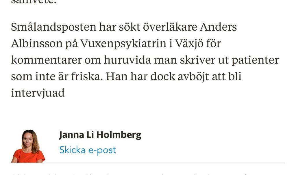 Reportern avslutar artikeln med att hon sökt mig, för en kommentar om huruvida psykiatrin i Växjö ”skriver ut patienter som inte är friska”.