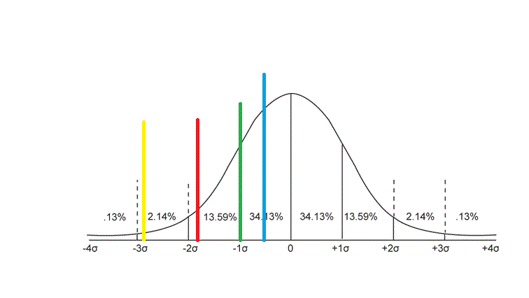 De olika färgmarkeringarna har jag satt dit för resonemangets skull. De motsvarar olika gränser man kan ha när man ställer diagnoser. Själv sätter jag gränsen vid den röda markeringen. Jag anser att ca 3-4% av människor kan ha en ADHD-diagnos. Orsaken till min gräns är att det är ungefär så många som kan ha nytta av centralstimulantia någon gång i livet. (Alla människor har nytta av strukturhöjande insatser, så det är ett dåligt mått på vilka som bör få diagnos).